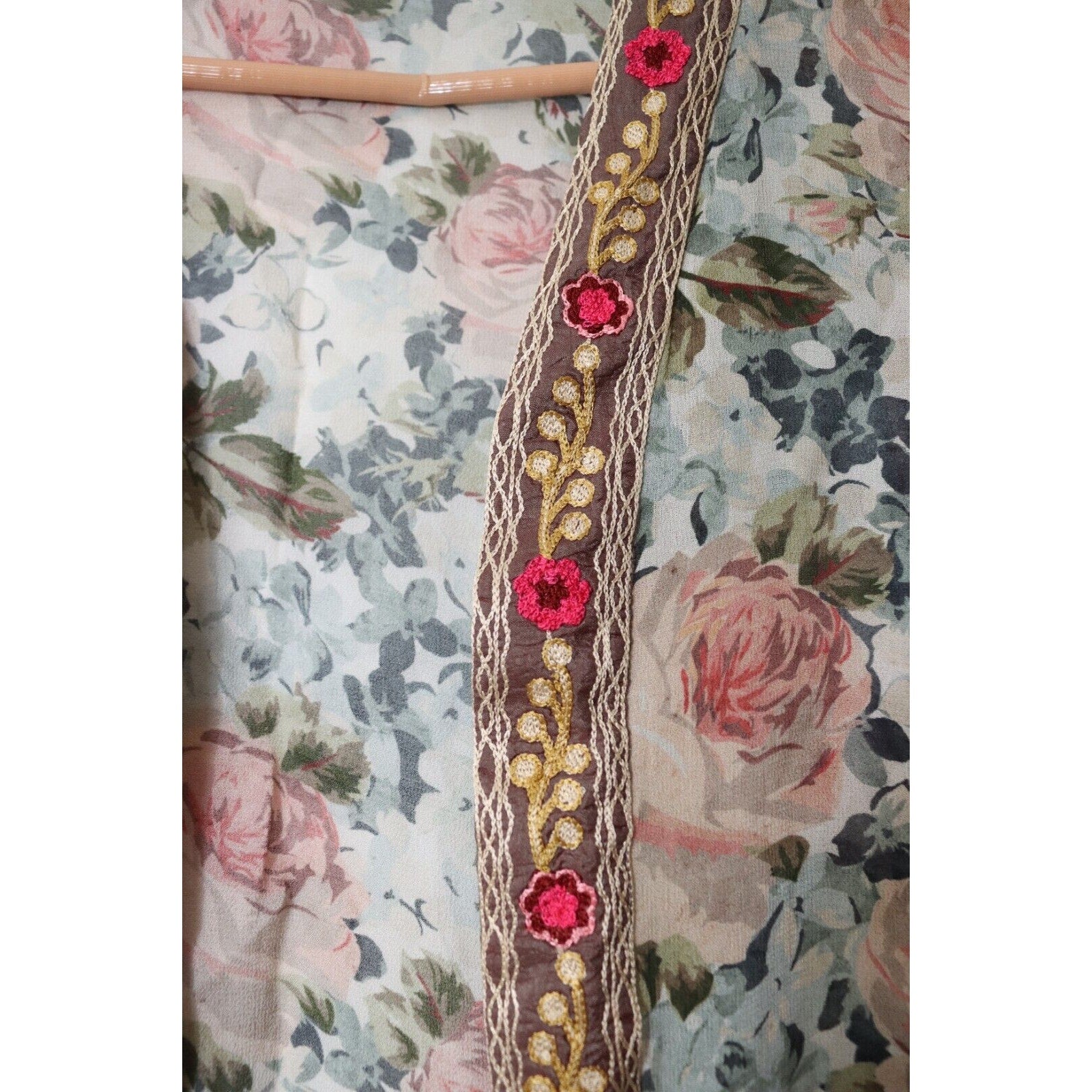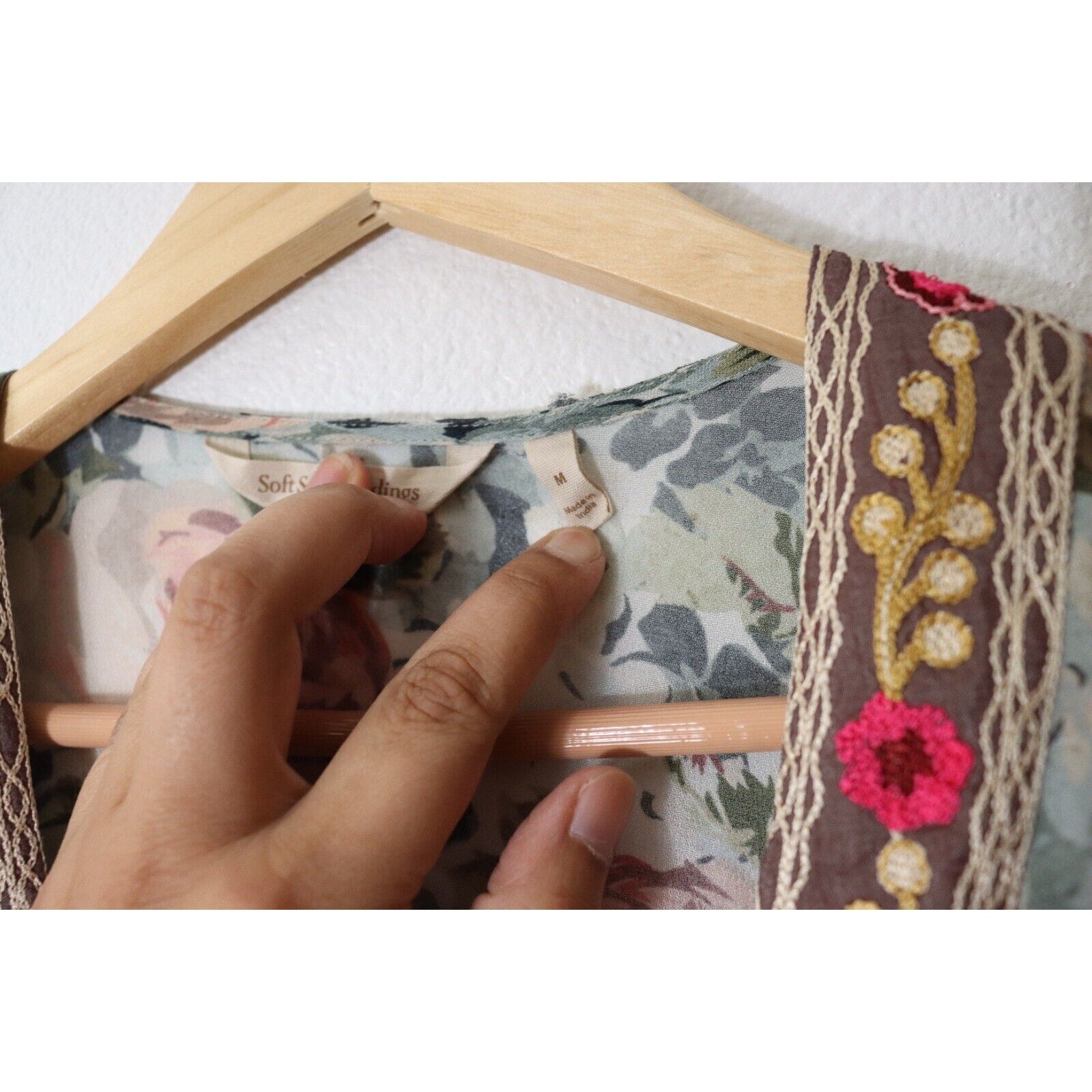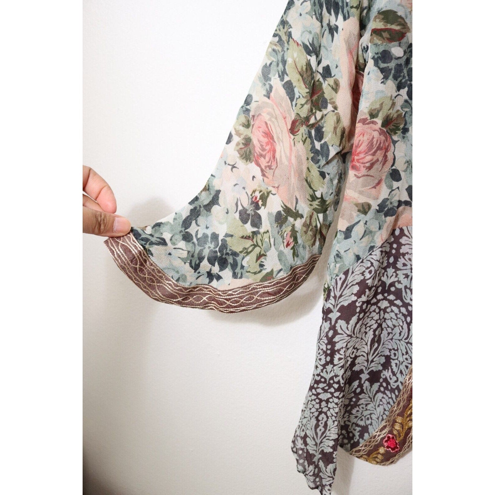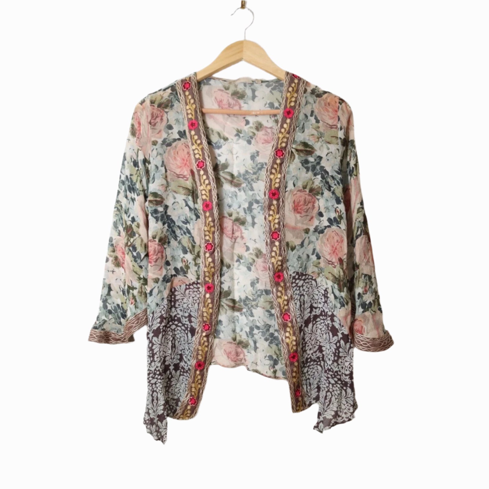 This Soft Surroundings cardigan is a colorful and bohemian addition to any wardrobe. The floral pattern, 3/4 sleeves, and open style make it perfect for layering over any outfit. The material is a blend of polyester and viscose, ensuring a comfortable and durable fit. This sweater is available in size medium and is suitable for regular sized women. The cardigan is not vintage and is made by the Soft Surroundings brand.