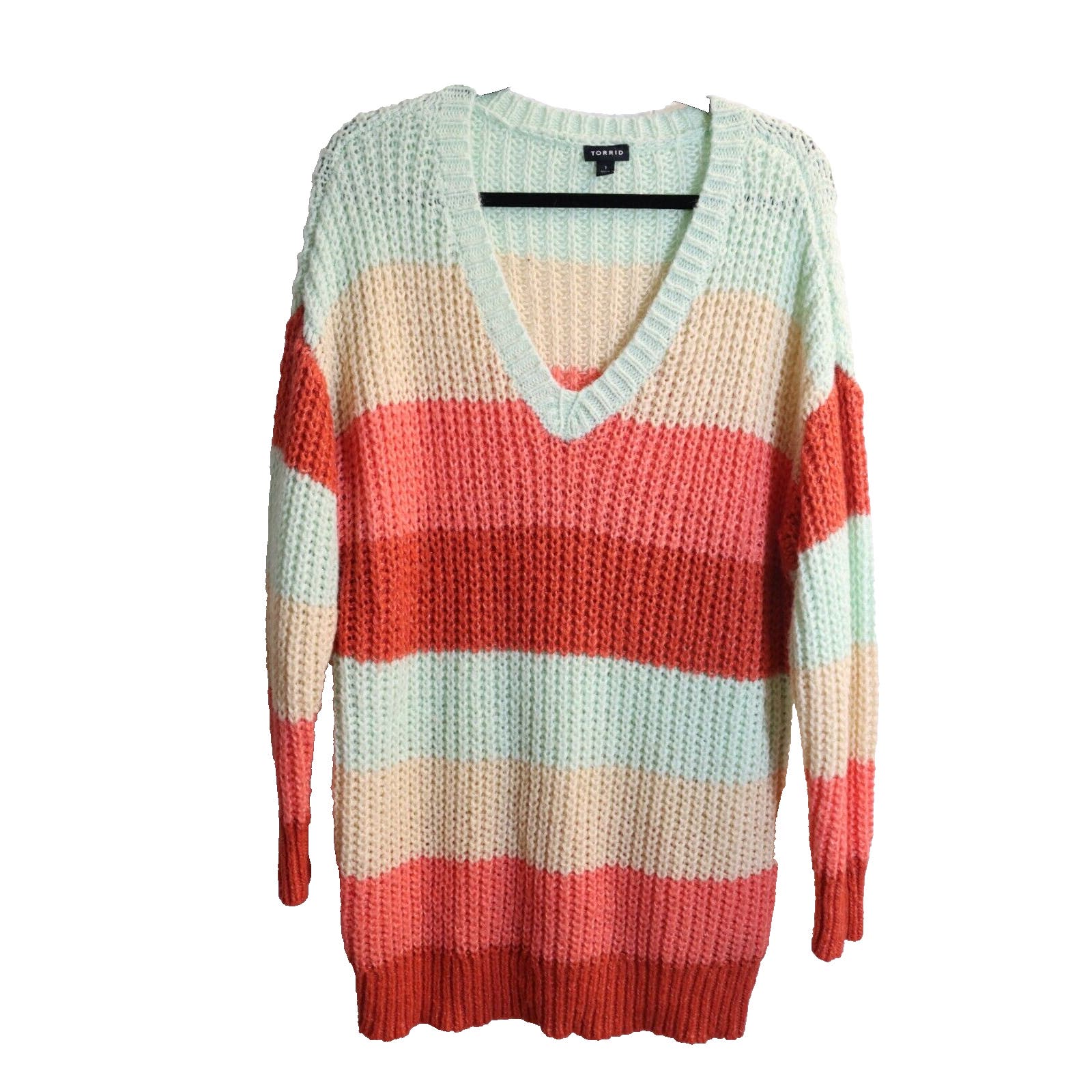 Get cozy and stylish in this colorful and bohemian Torrid sweater. The chunky-knit striped pullover features a flattering V-neckline and long sleeves, perfect for winter, fall, and spring seasons. The sweater is made of a soft and comfortable knit fabric with a mix of polyester, nylon, and acrylic materials. This plus-size sweater, size 1 (1X), is a must-have for women who love trendy and chic clothing. The sweater is perfect for casual or dressy occasions and can easily be paired with jeans, skirts, or leggings. Grab this beautiful Torrid sweater for your wardrobe and stay fashionable all year long.