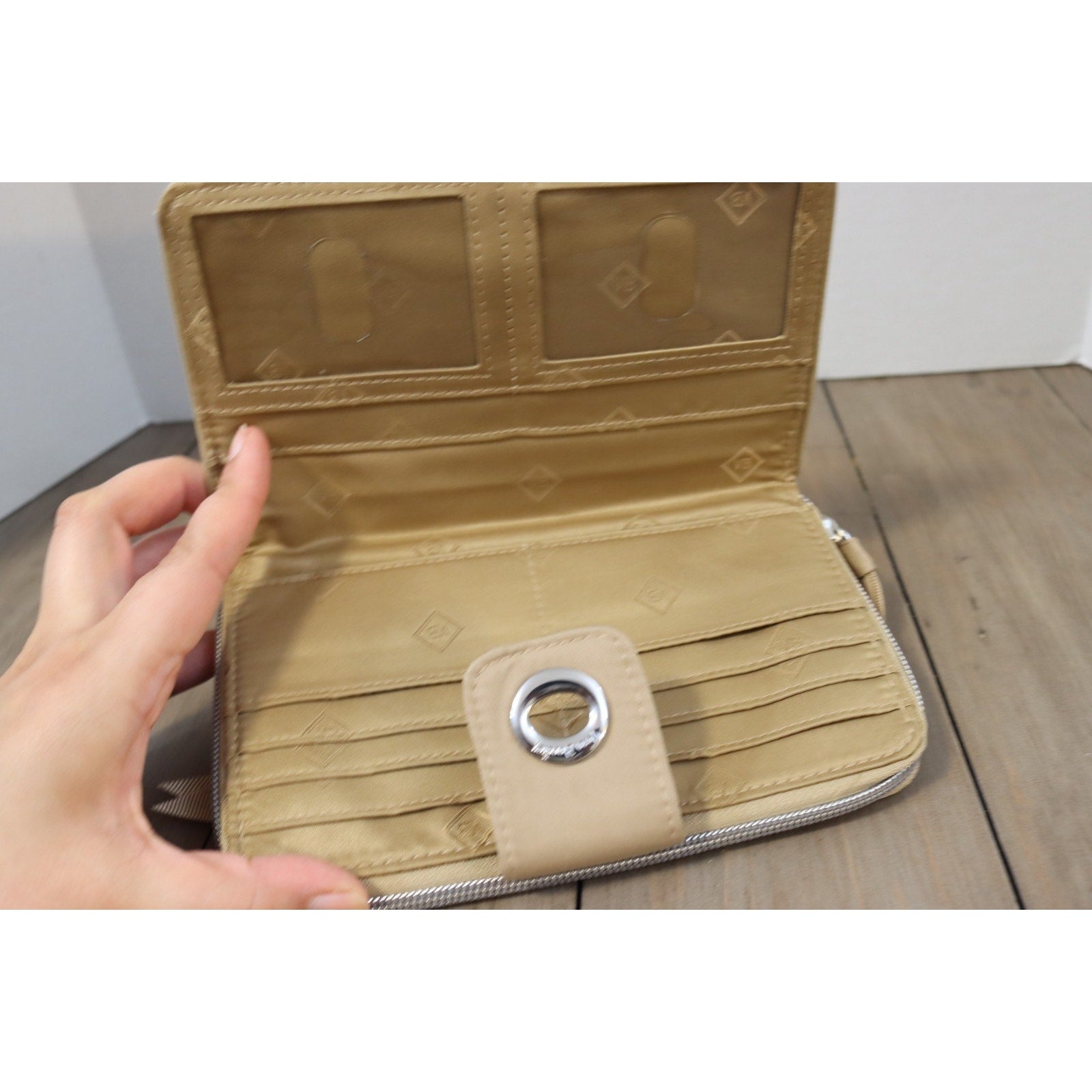 The Vera Bradley Beige Large Wallet is a stylish and spacious accessory designed for women. Made from a soft cotton blend material, this wallet features a solid beige color with a quilted design. With multiple credit card slots, this wallet is both practical and trendy, perfect for keeping your essentials organized and on hand. This one-size wallet from Vera Bradley is a versatile and chic addition to any wardrobe.
