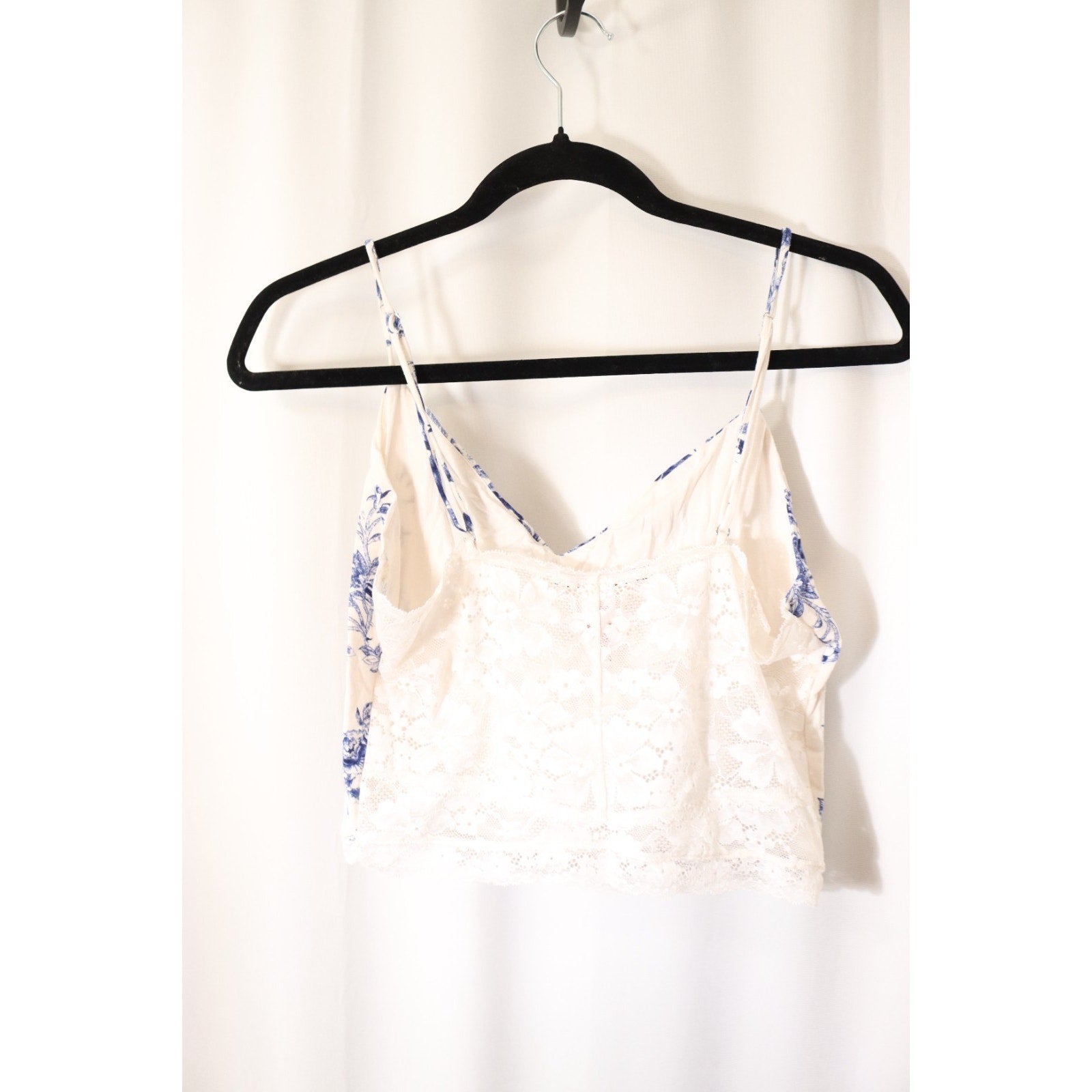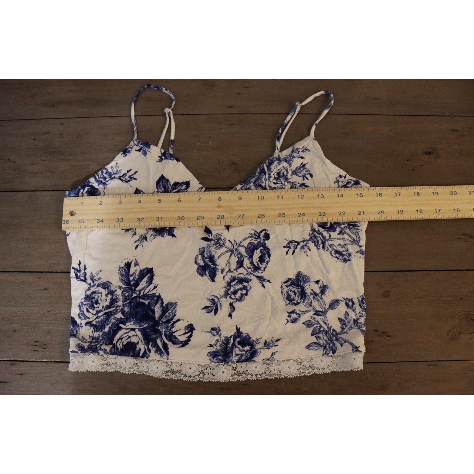 The Victoria's Secret top is a stylish tank top in a blue floral pattern with white accents. This sleeveless top features a V-neckline and strappy sleeves, perfect for a casual occasion during the summer or spring season. Made from lightweight and breathable lace fabric, this pullover top in size medium offers a regular fit. The camisole style top by Victoria's Secret is adorned with a delightful flower theme, making it a versatile and chic addition to any woman's wardrobe.