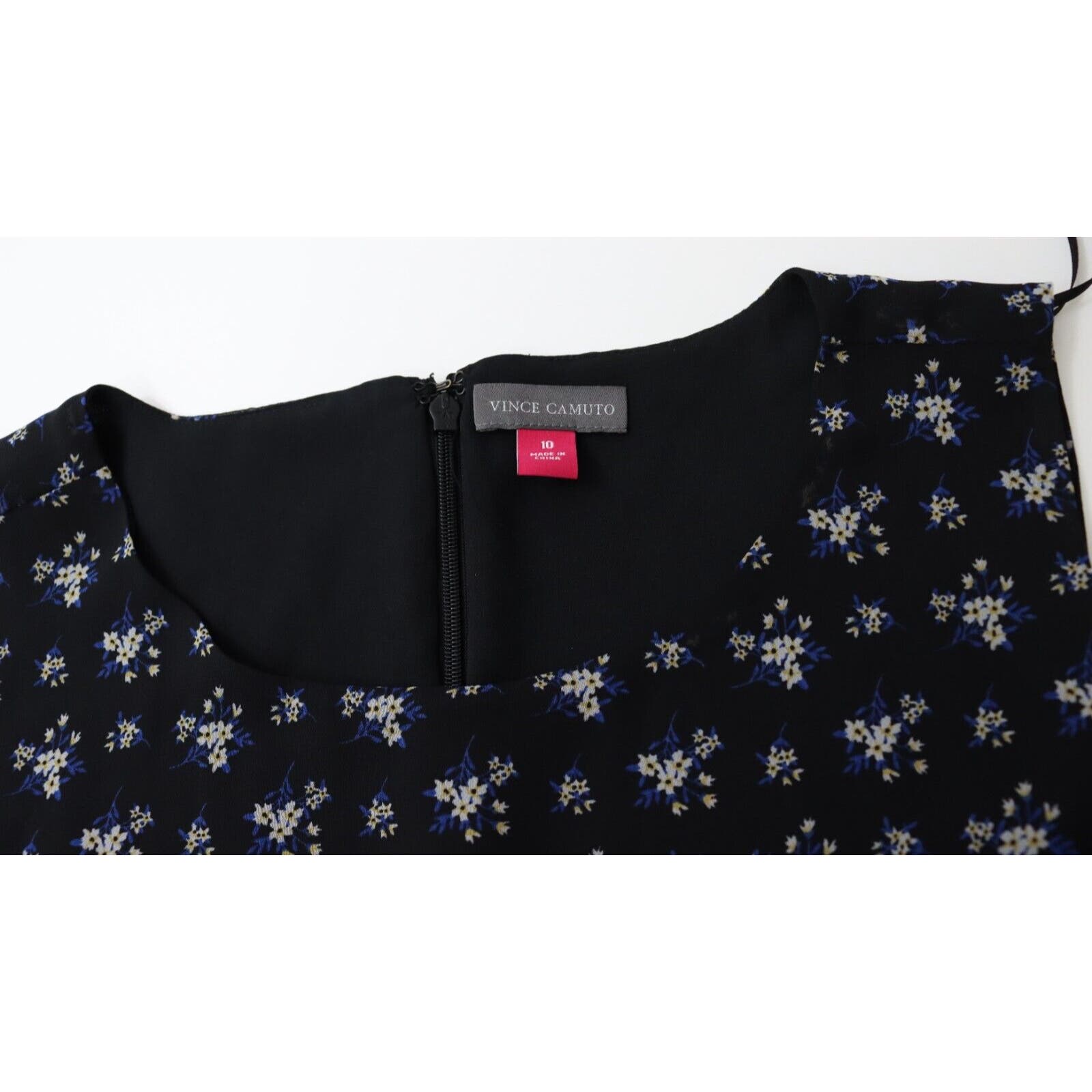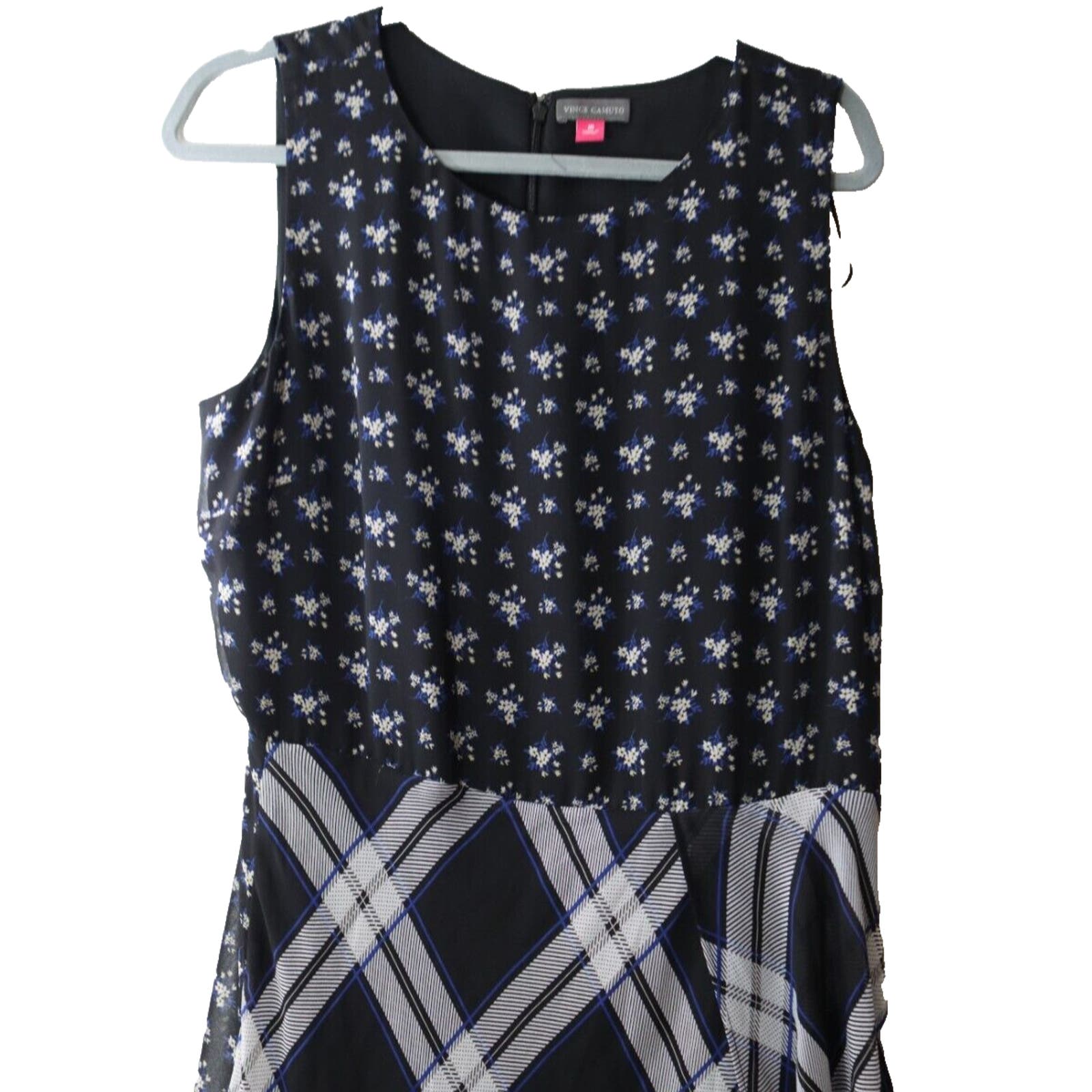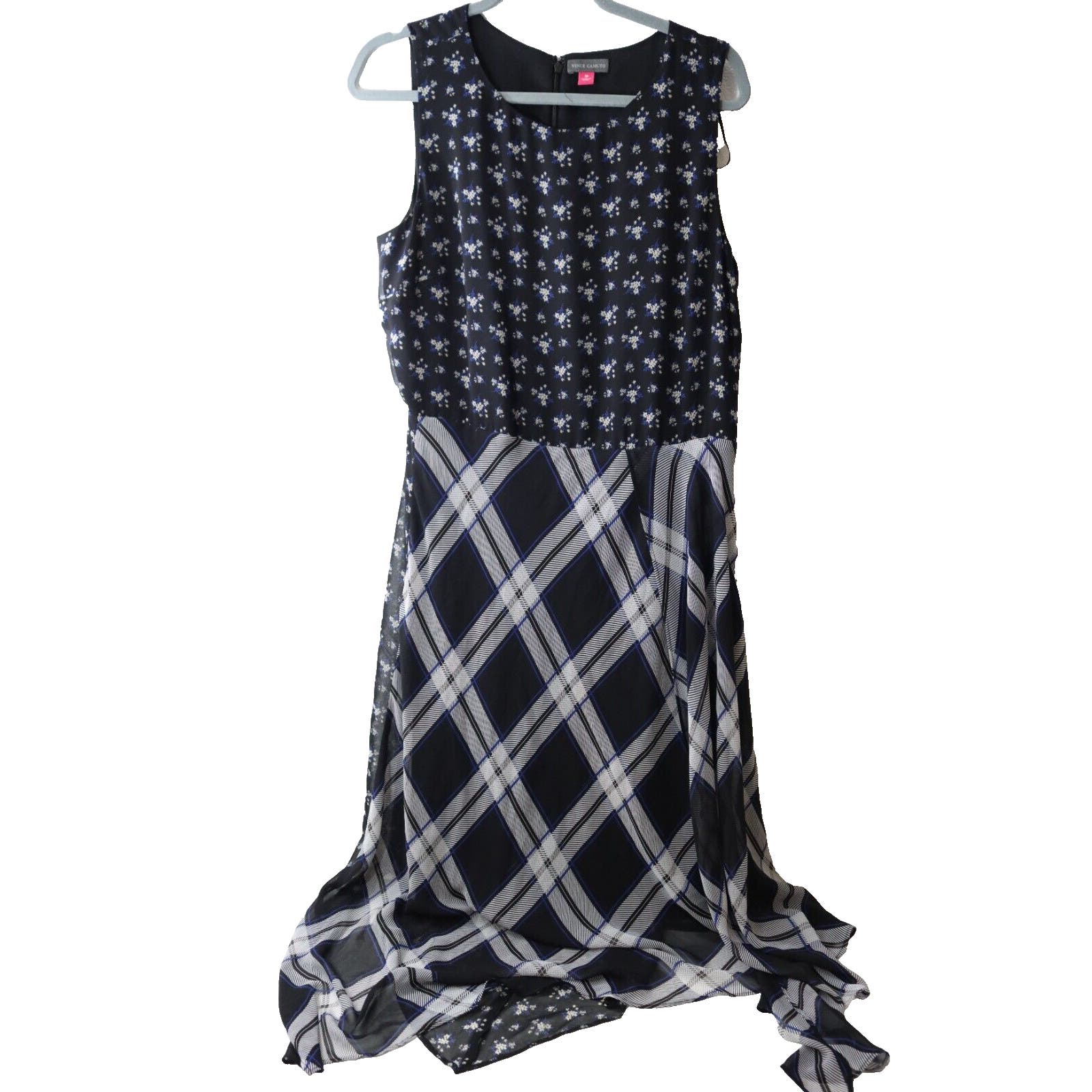 Elevate your wardrobe with this stunning Vince Camuto Sleeveless Dress. The dress boasts an eye-catching geometric pattern that will make you stand out in any occasion. It features a round neckline, asymmetrical hemline and a zip closure for added convenience. Perfect for any season, this dress can be dressed up or down for party/cocktail, casual or business events. The fit & flare style is designed to flatter your figure while the sleeveless design and knee-length make it perfect for summer, fall and spring. Available in size 10, this dress is a must-have for any fashion-forward woman.