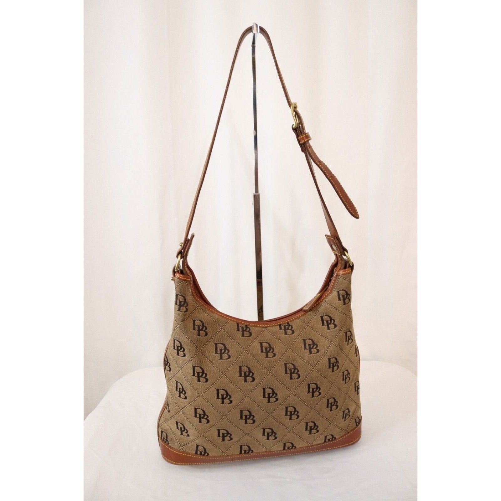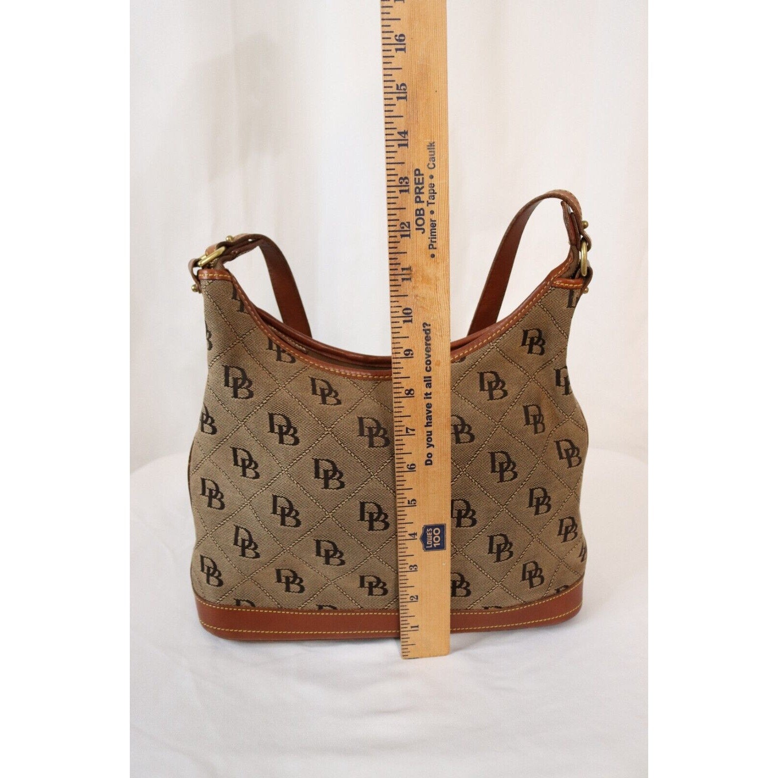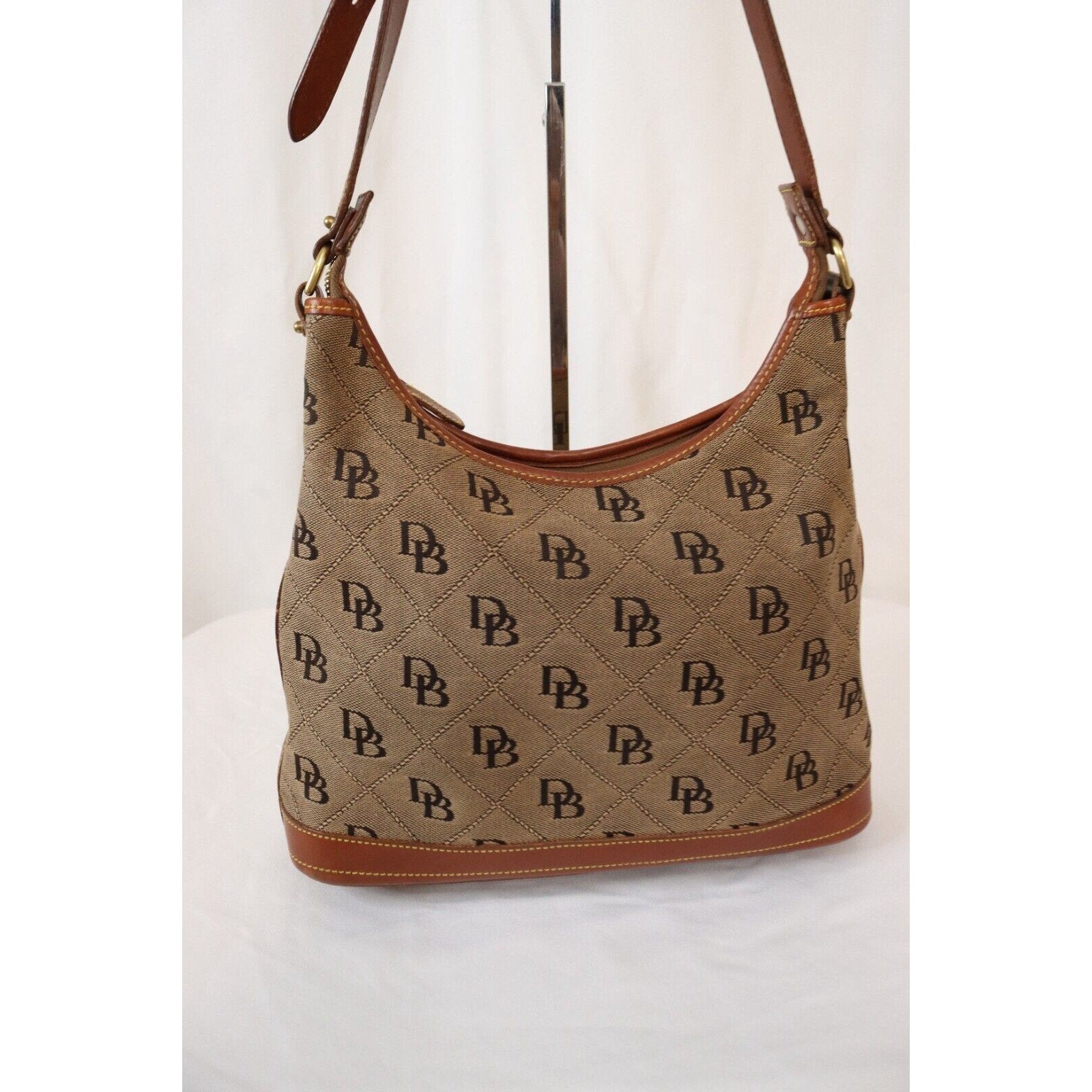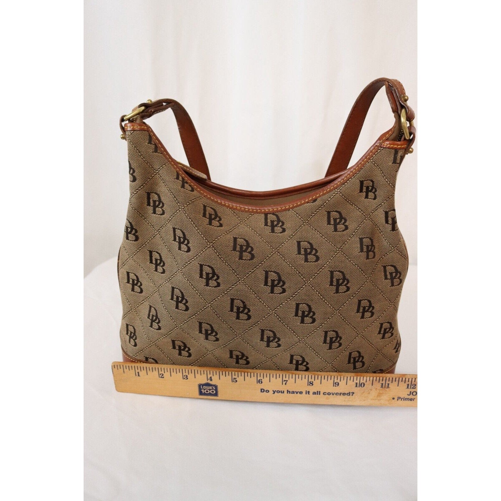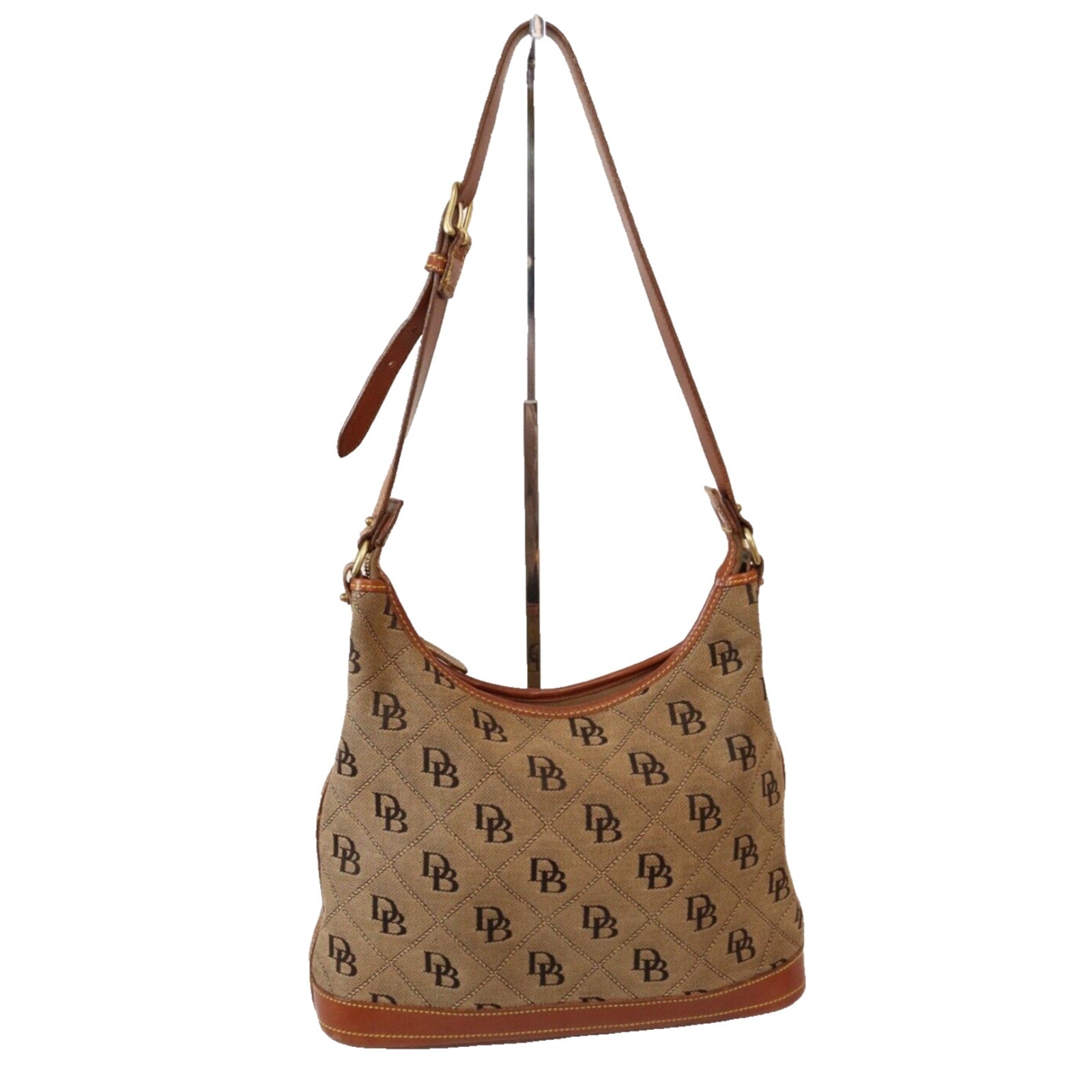 This is a vintage Dooney & Bourke shoulder bag in brown monogram canvas with a zip closure and brown leather handle. It is large in size and features gold hardware, a strap accent. The classic designer bag is suitable for travel, casual outings, or business use.