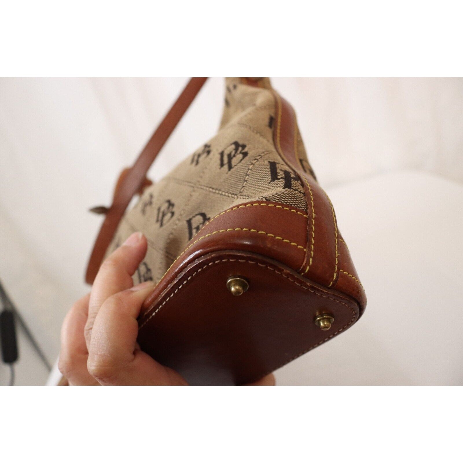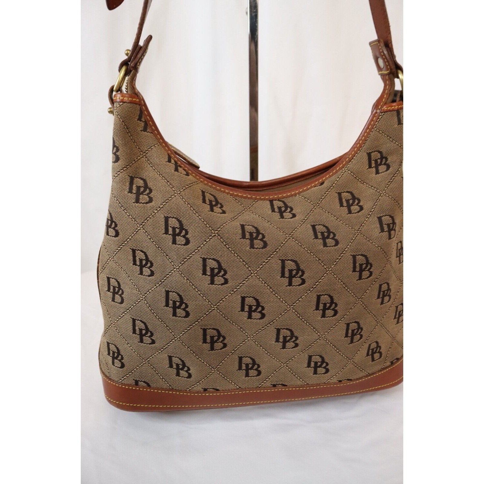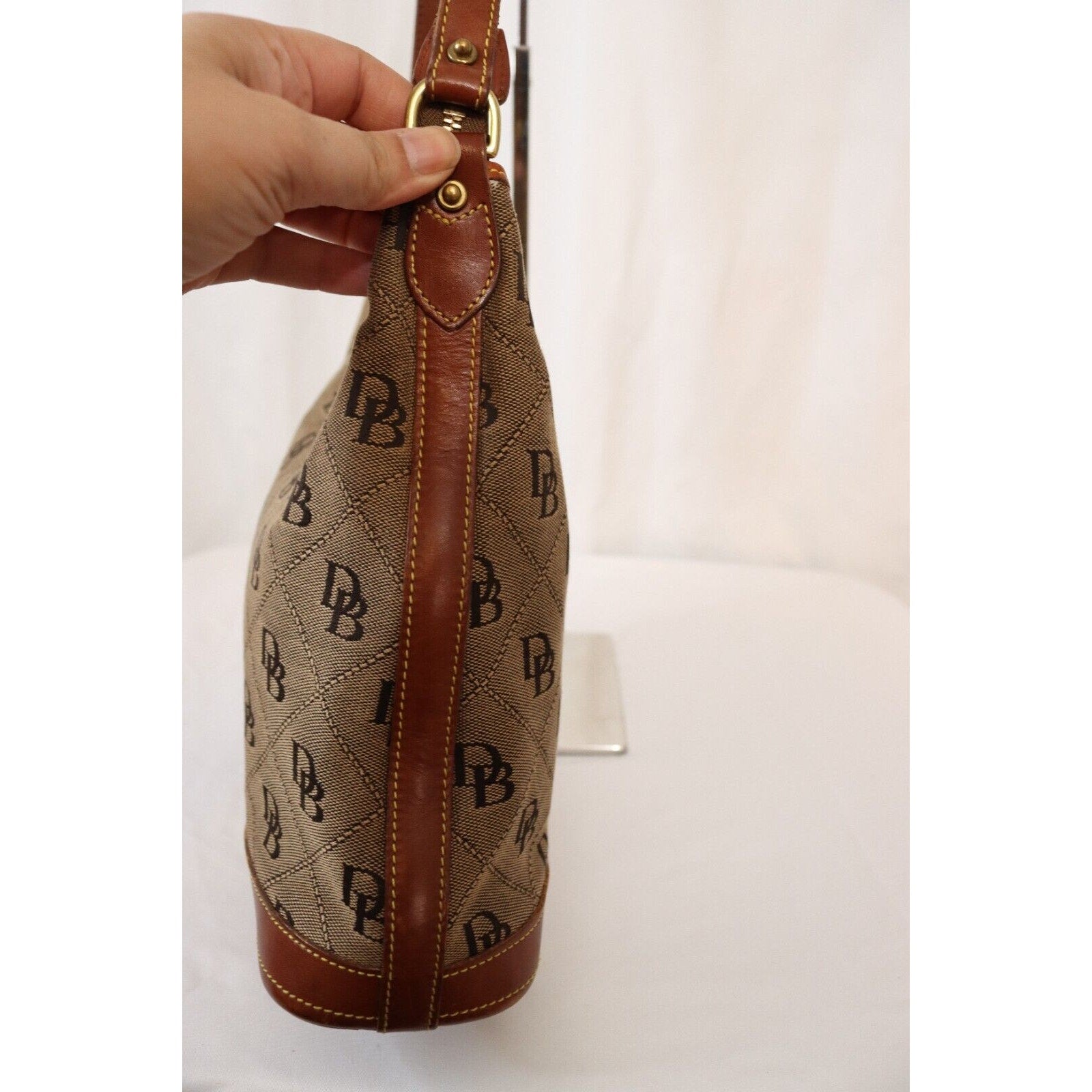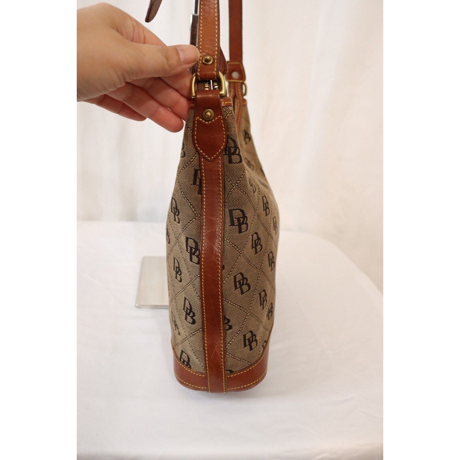 This is a vintage Dooney & Bourke shoulder bag in brown monogram canvas with a zip closure and brown leather handle. It is large in size and features gold hardware, a strap accent. The classic designer bag is suitable for travel, casual outings, or business use.