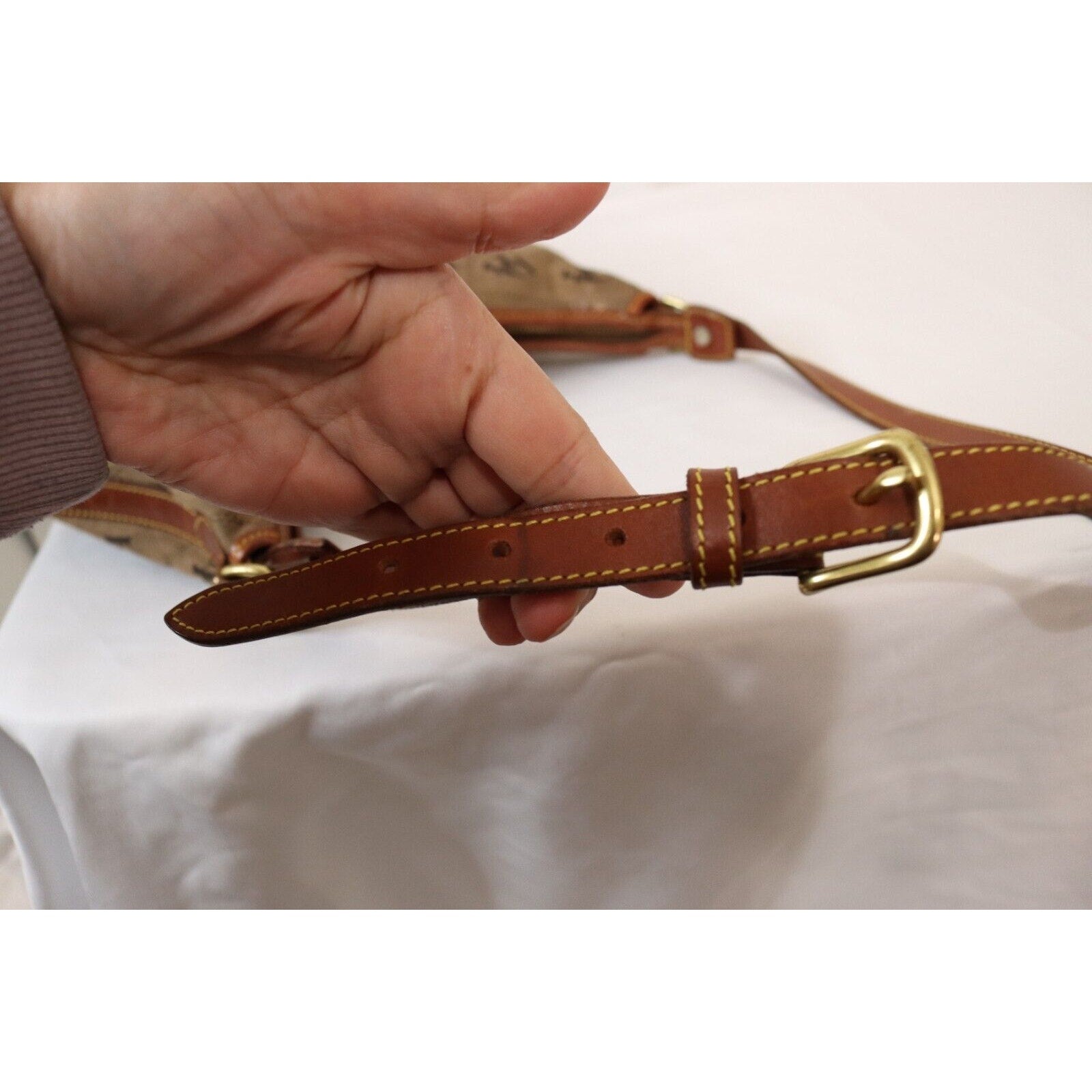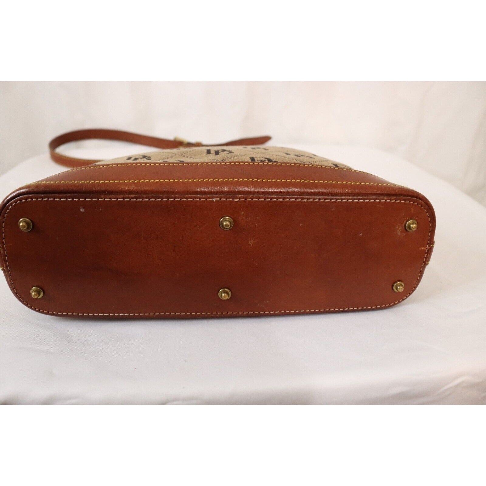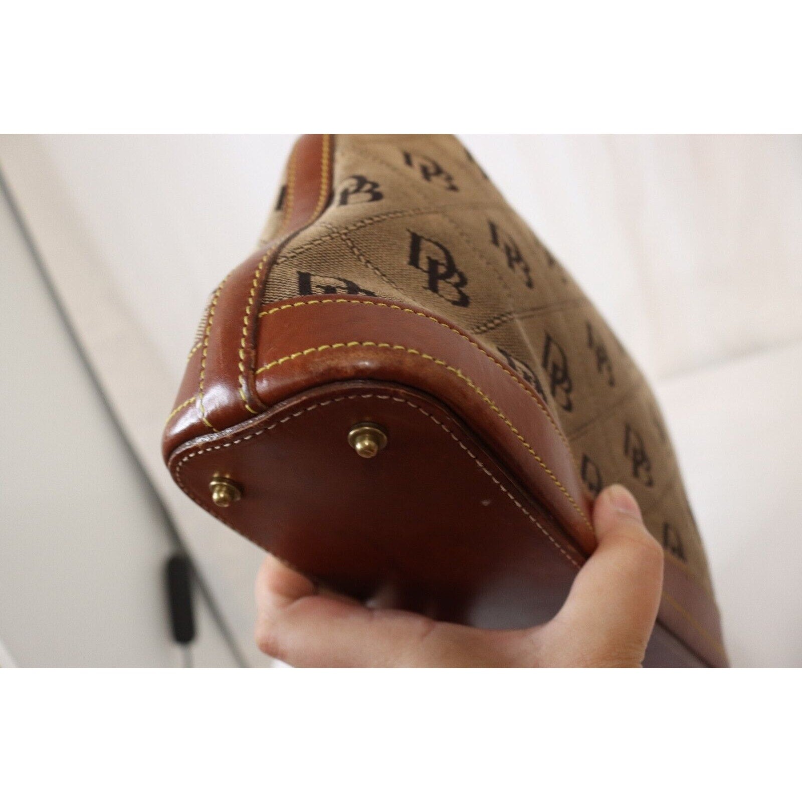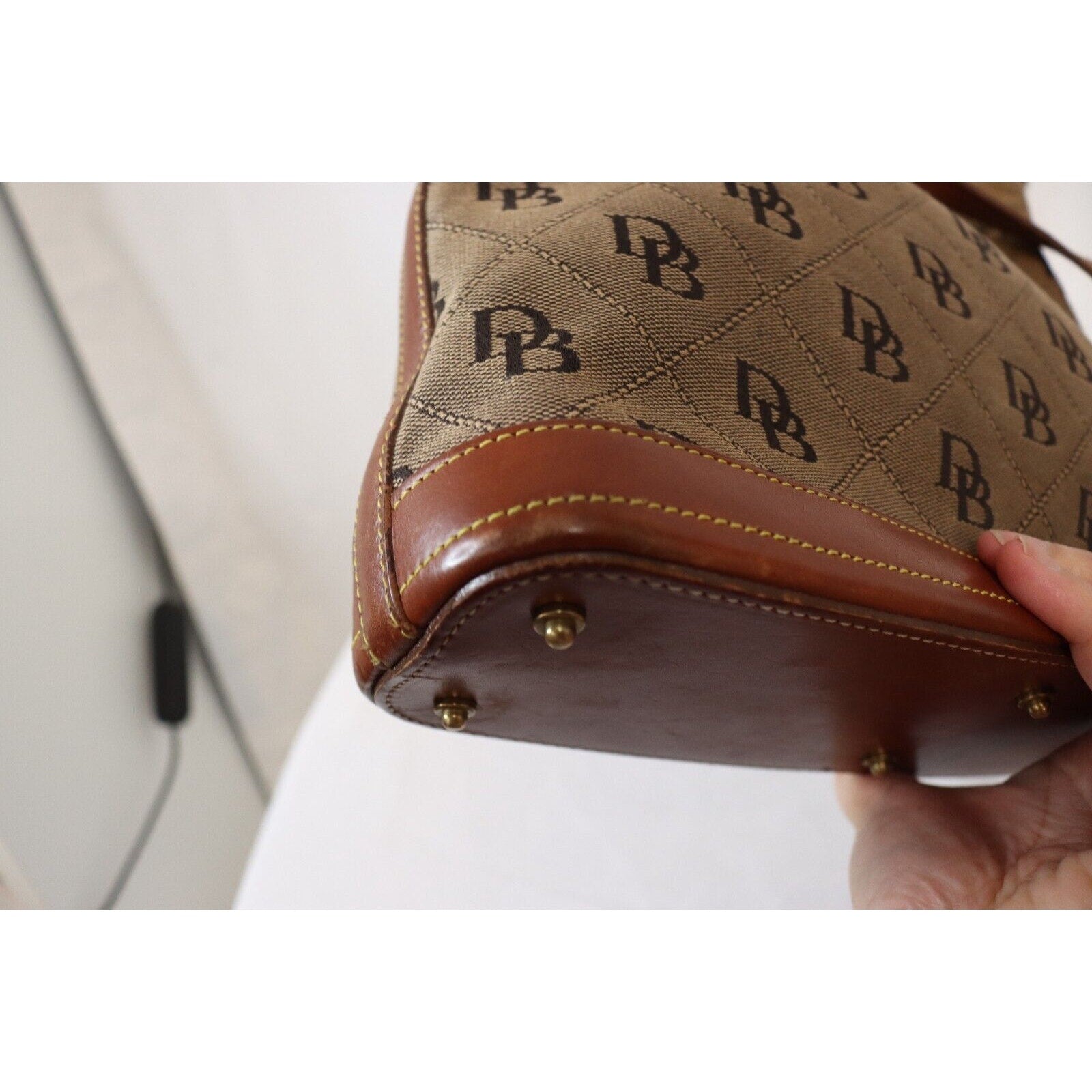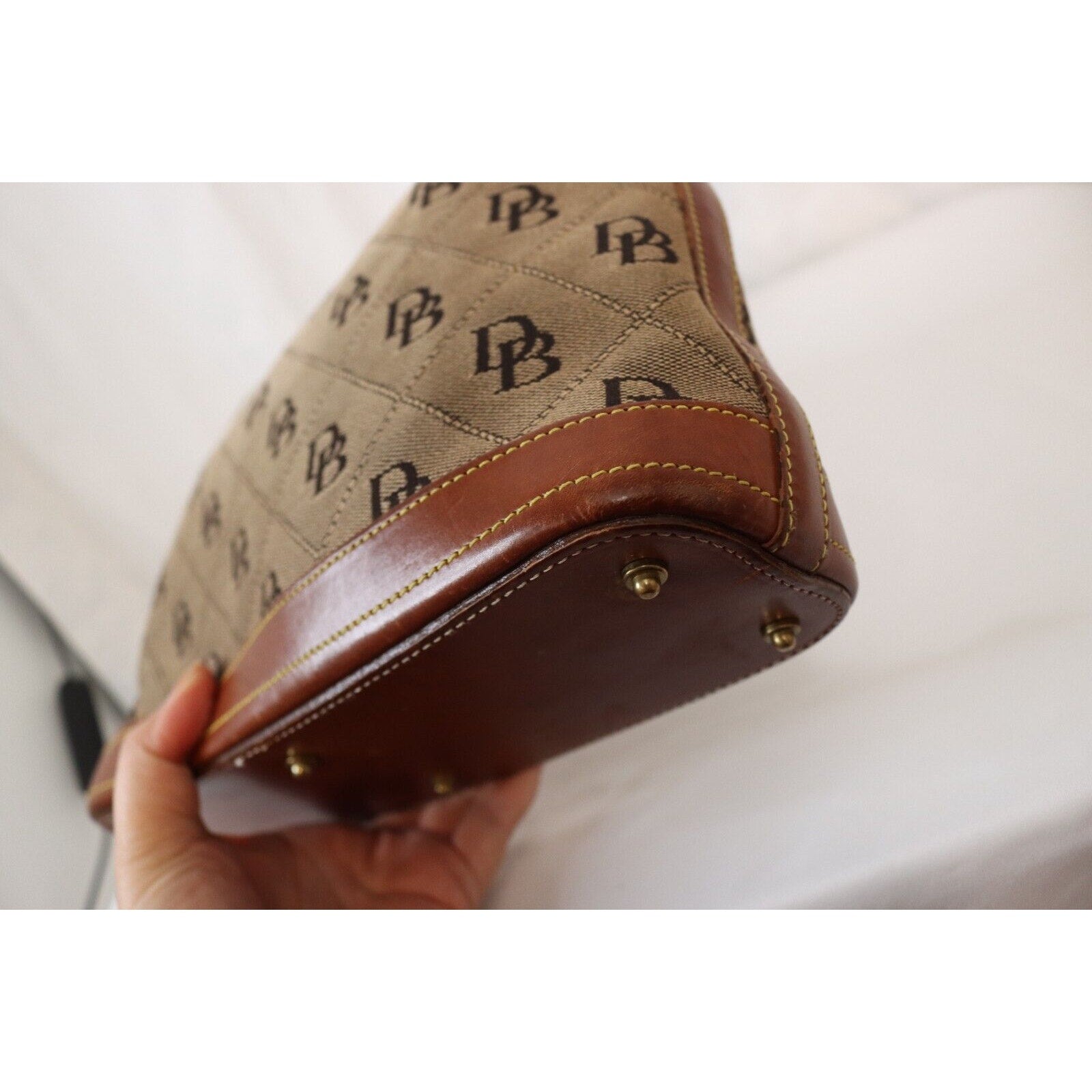 This is a vintage Dooney & Bourke shoulder bag in brown monogram canvas with a zip closure and brown leather handle. It is large in size and features gold hardware, a strap accent. The classic designer bag is suitable for travel, casual outings, or business use.
