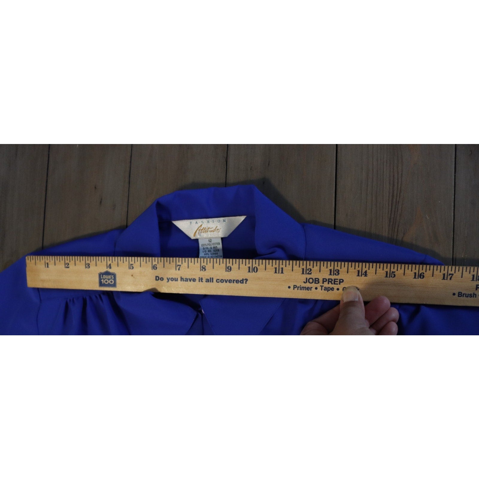 The Vintage Fashion Attitudes Blue Long Sleeve Hidden Button Top in polyester, size 12, is a stylish and versatile blouse perfect for a casual occasion. The solid blue color, collared neckline, and button closure add a touch of retro flair to the top. With a regular fit and lightweight material, this blouse is suitable for the summer, fall, and spring seasons, making it a great addition to any woman's wardrobe. The vintage theme and basic style of the top make it a timeless piece that can be worn for years to come.