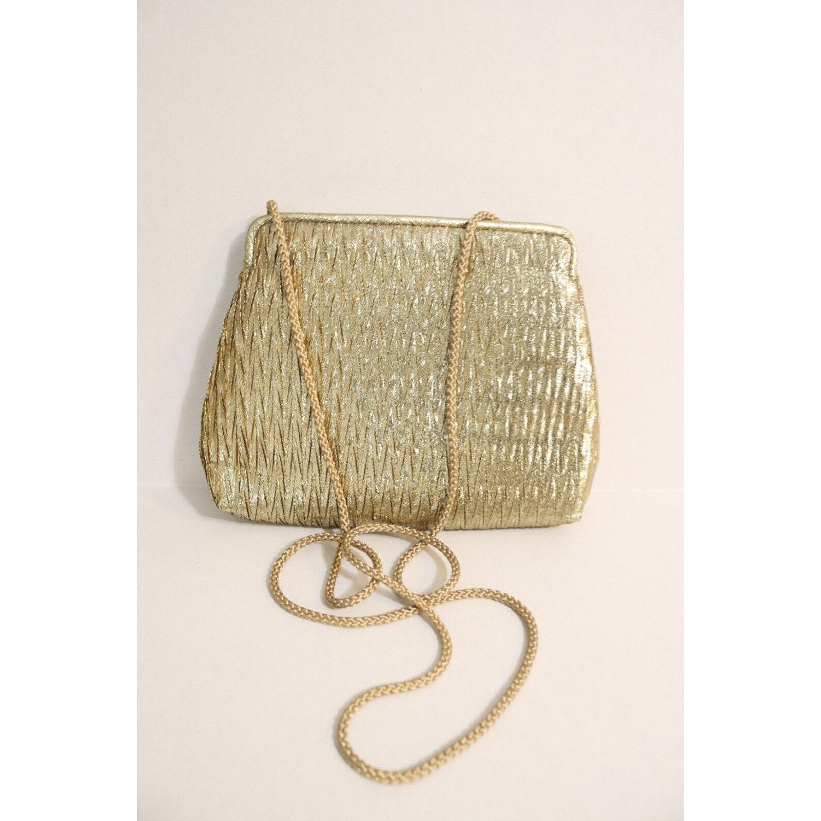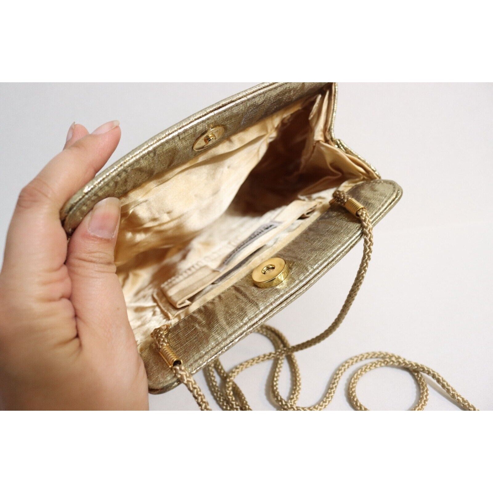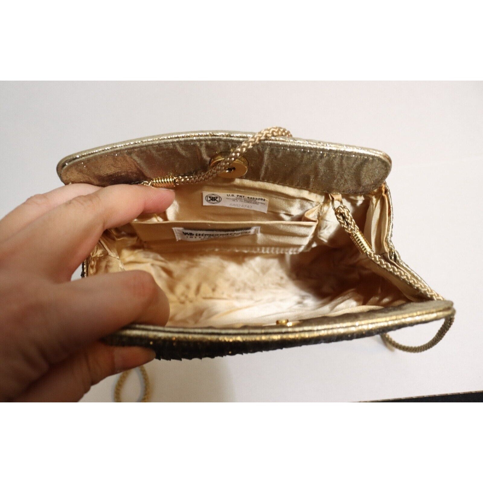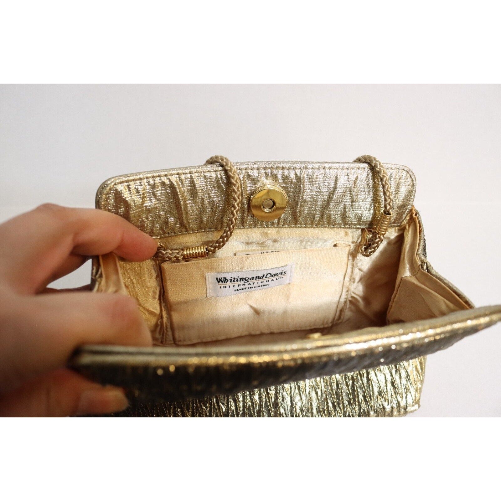 This is a vintage Whiting & Davis International gold evening bag made of fabric. The bag is an original piece from China and is designed for evenings out, particularly cocktail occasions. It features a classic evening bag style and is suitable for women looking to accessorize their eveningwear with a touch of elegance and sophistication.