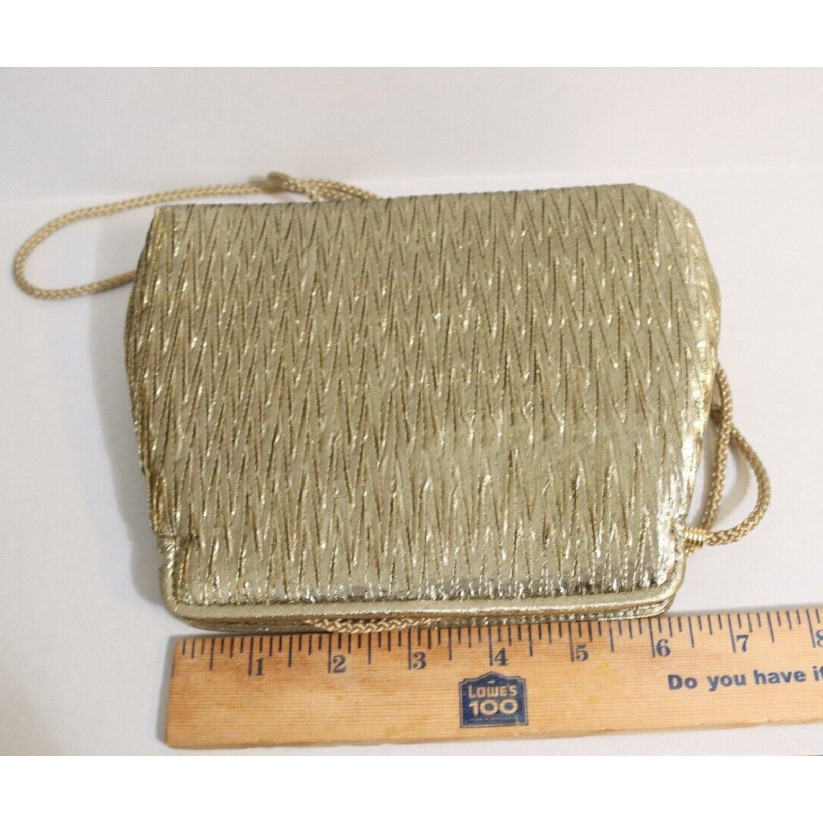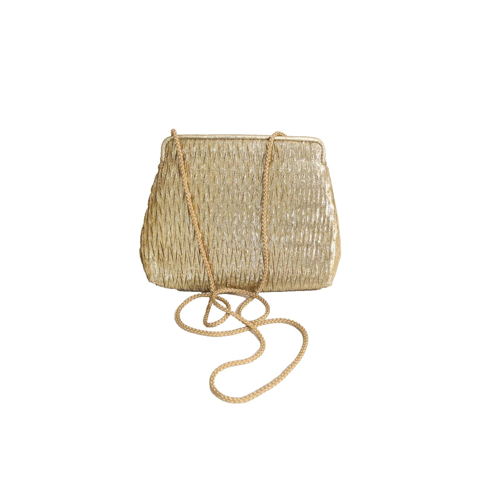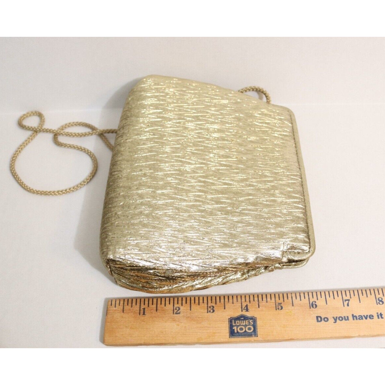 This is a vintage Whiting & Davis International gold evening bag made of fabric. The bag is an original piece from China and is designed for evenings out, particularly cocktail occasions. It features a classic evening bag style and is suitable for women looking to accessorize their eveningwear with a touch of elegance and sophistication.