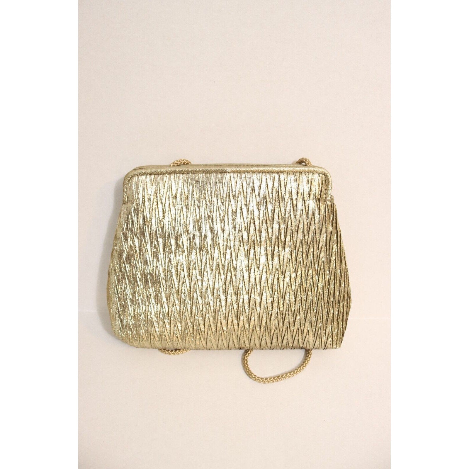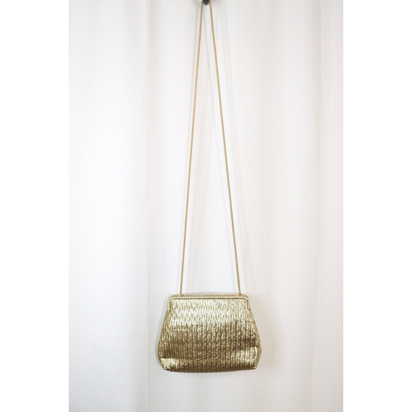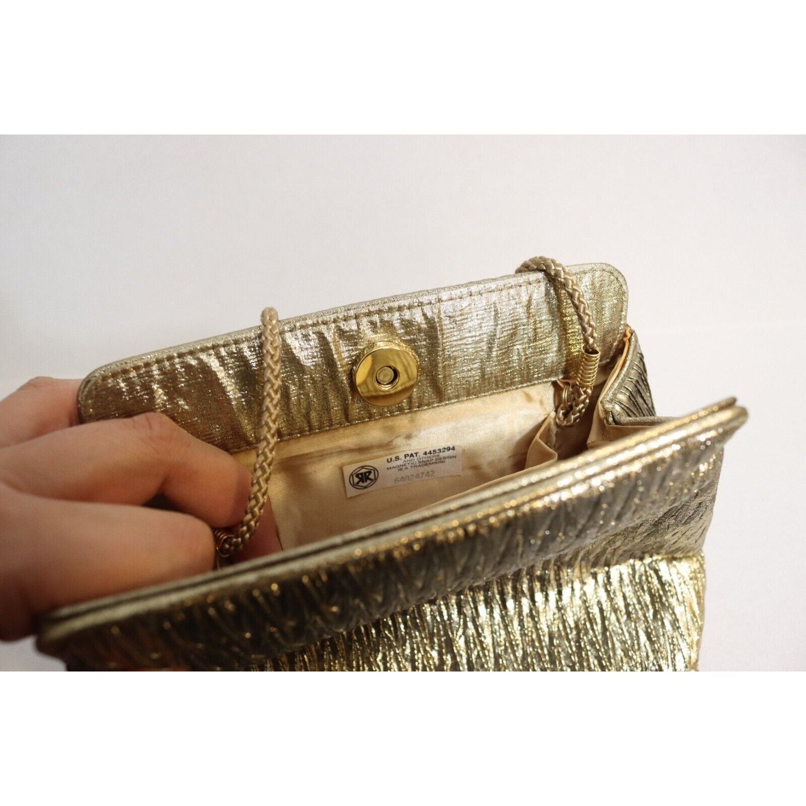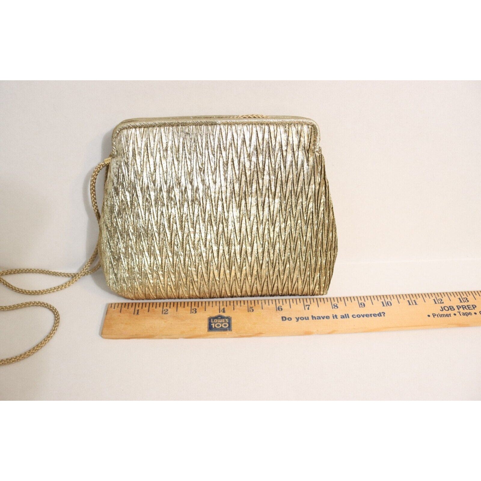 This is a vintage Whiting & Davis International gold evening bag made of fabric. The bag is an original piece from China and is designed for evenings out, particularly cocktail occasions. It features a classic evening bag style and is suitable for women looking to accessorize their eveningwear with a touch of elegance and sophistication.