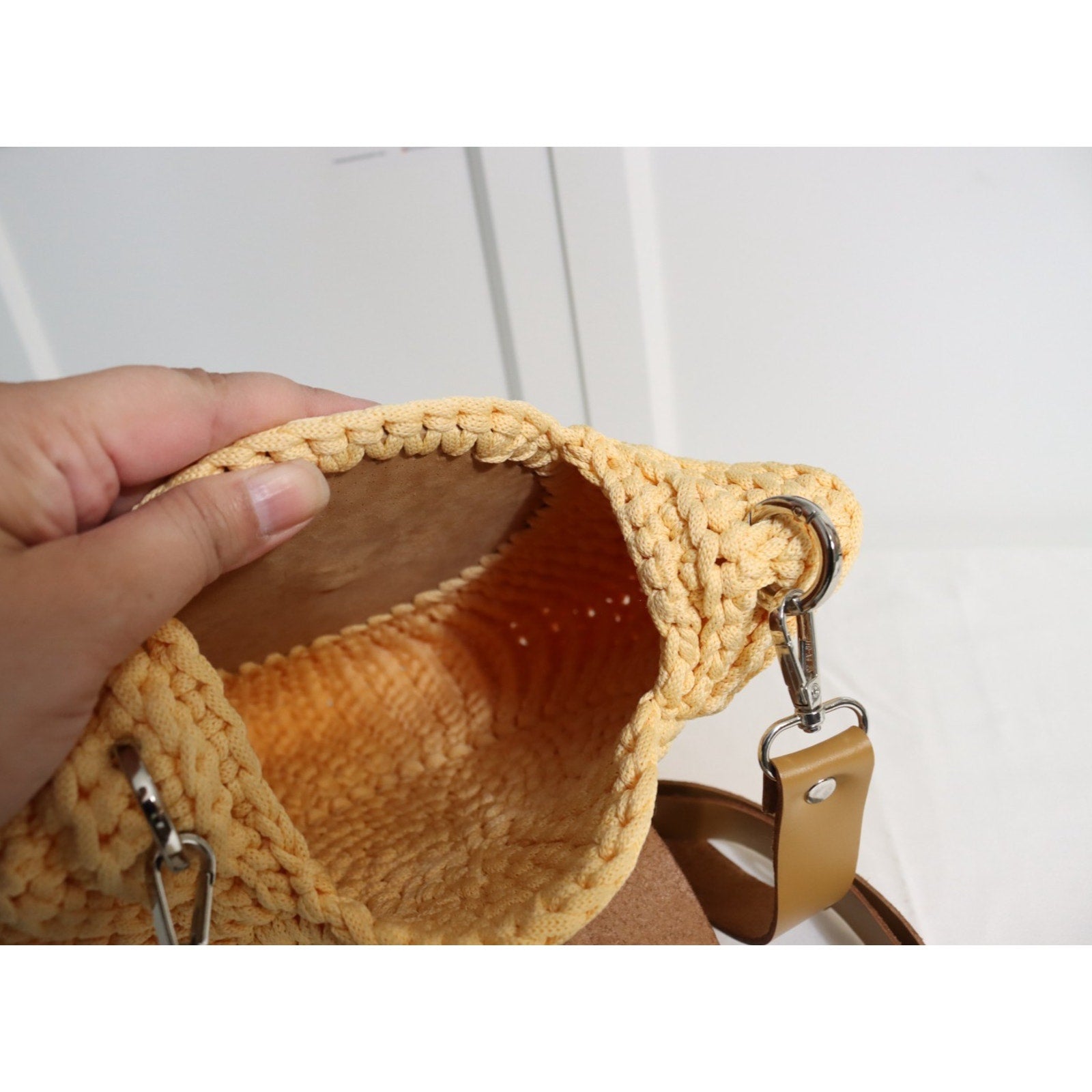 The Yellow and Brown Knit Bag Crossbody is a stylish and versatile accessory for women. Made from a solid yellow knit fabric with brown handles/straps, this medium-sized crossbody bag is perfect for everyday use. The vibrant yellow color adds a pop of color to any outfit, while the comfortable brown strap allows for easy and hands-free carrying. This trendy bag is both practical and fashionable, making it a must-have for any woman's wardrobe.